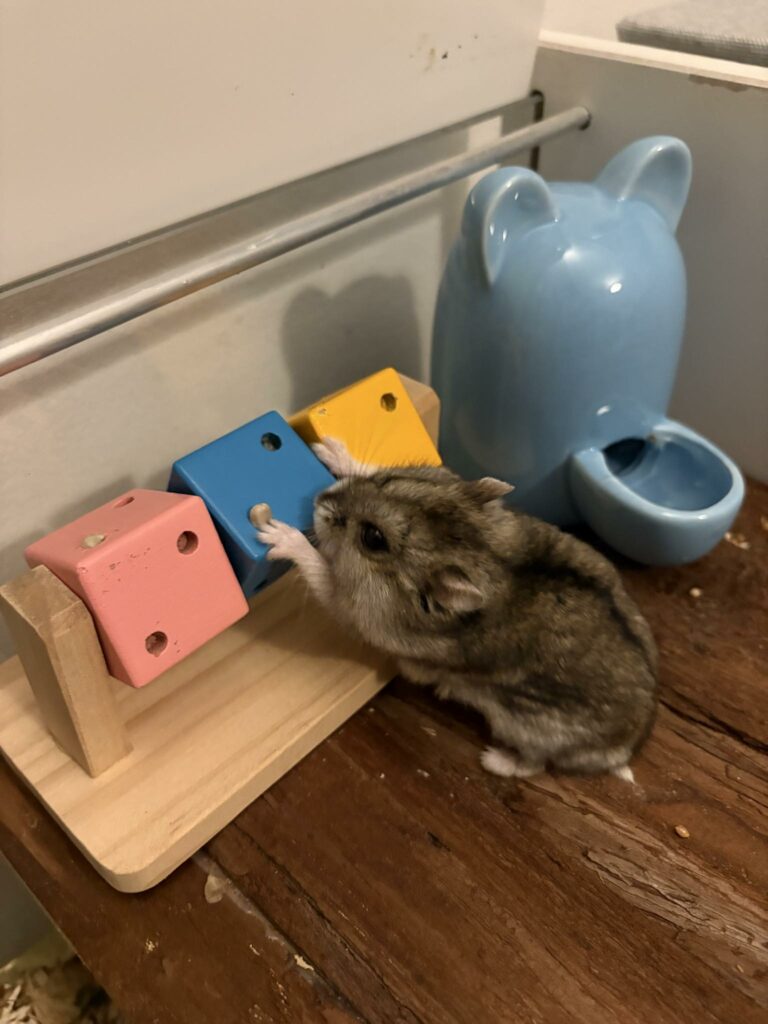 Il aura besoin d’un très grand espace de vie avec une épaisseur de litière de 30 cm, cage faîte sur mesure ou cage style skyline marracheck, ou bien une cuve bien aérée, et surtout avec de nombreux enrichissements (surlitière, pont, tunnel, boite à explorer etc …) et une roue de minimum 28 cm de diamètre.